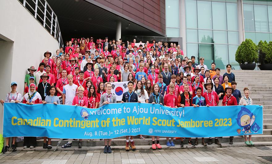 The Canadian contingent of World Scout Jamboree 2023 who stayed at Ajou University returned home safely. A total of 200 Canadian Scouts who withdrew from the camping site at Saemangeum due to the northern advancement of a typhoon stayed at Ajou University dormitory and continued their activities there for four days from August 8.A farewell event was held for the Canadian students on the morning of August 12 at the New Student Union Building of Ajou University. On behalf of the 200 members, the leader and students delivered greetings and shared their memories of the World Scout Jamboree and Ajou University.James Cadence said, “Although the situation was not what we expected, we are glad to have had this new experience. We thank Ajou University for offering the best dormitory and meals.” The university prepared refreshments and souvenirs for the Scouts. Drinks were also donated by Kim Jin-hwan, who lives near the university, to welcome and encourage the Canadian Scouts.A total of 200 Canadian Jamboree Scouts, including leaders, arrived at Ajou University in the afternoon of August 8. Although it was an quick decision, as World Scout Jamboree members had to leave Saemangeum, Jeollabuk-do, due to Typhoon Khanun’s advance north, Ajou University acted promptly to ensure the convenience and safety of the Scouts.Dormitory facilities were prepared based on the exact number of Scouts and their gender ratio. As the Canadian Scouts arrived in teams, orientations were held on Ajou University and its dormitory facilities. During the Scouts’ stay, breakfast, lunch, and dinner, as well as snacks such as fruit and fried chicken, were provided in the dormitory dining room. The Scouts participated in various cultural and experiential events prepared by Suwon City, including a tour of Suwon Hwaseong Fortress and visits to galleries, art centers, and museums.The World Scout Jamboree event is organized by the World Organization of the Scout Movement every four years. It is attended by youths aged 14 to 17 from all over the world. This year’s 25th World Scout Jamboree was held in Saemangeum, Buan-gun, Jeollabuk-do. Before the arrival of the Scouts at Ajou University, welcome kits containing slippers and toiletries were prepared. Fruit, sandwiches, and drinks were also on hand. A resident donated drinks to welcome the Canadian Scouts staying at Ajou University.Posing for a photo at the farewell event with a Canadian flag bearing messages from the 200 Canadian Scouts that stayed at Ajou UniversityCanadian Jamboree Scouts preparing to return home after their four-day stay at Ajou University