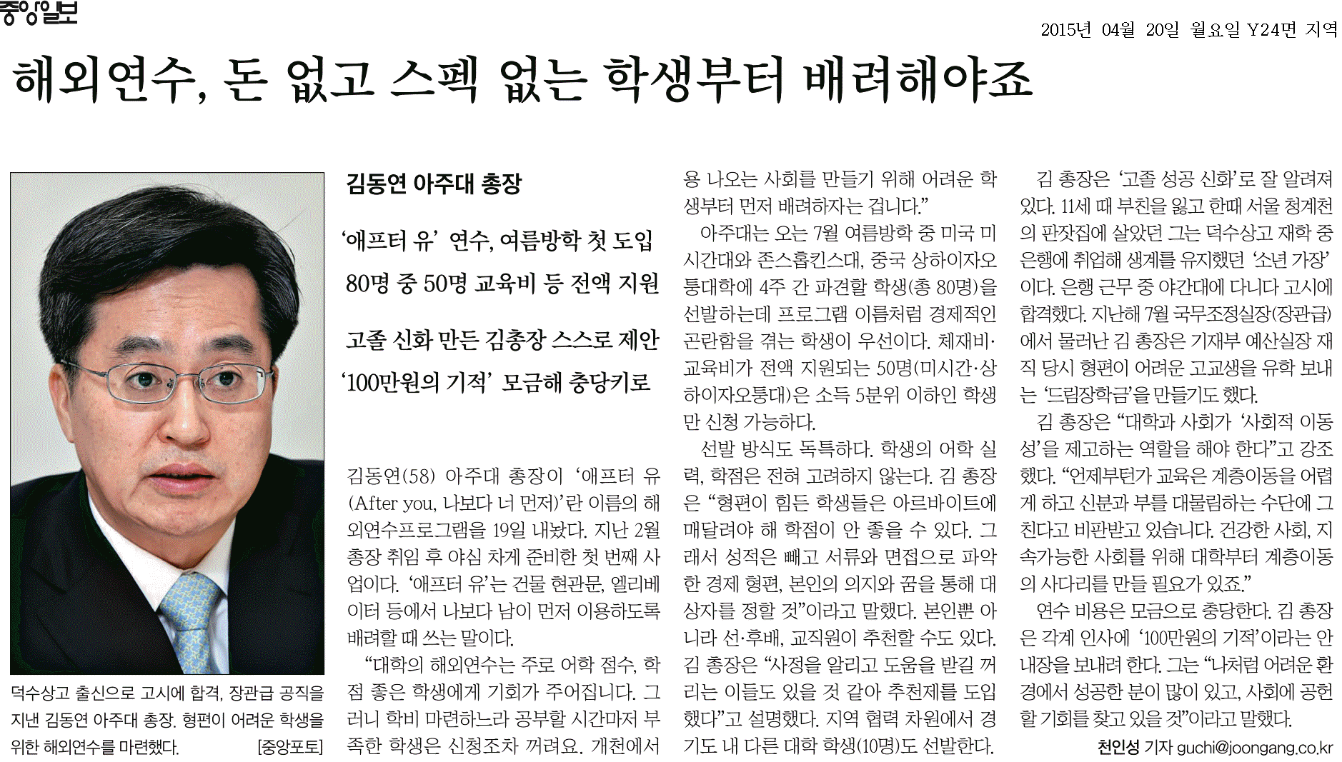 중앙일보가 20일자 지면을 통해 우리 학교 “After You”프로그램에 대해 보도했다. “After You”프로그램-2015 여름 아주 글로벌 캠퍼스는 여러 어려움 탓에 해외 경험을 쌓기 힘들었던 학생들을 위해 마련된 해외 집중 연수 프로그램이다. 중앙일보는 기사를 통해 “After You”프로그램의 ▲취지 ▲내용 ▲선발방식 등을 소개했다. 김동연 총장의 주도로 진행되고 있는 외부 모금에 대해서도 언급했다. 이 프로그램을 기획한 김동연 총장은 “대학의 해외 연수 기회는 주로 어학점수와 학점이 좋은 학생에게 주어지기 때문에 학비 마련하느라 공부할 시간마저 부족한 학생은 신청조차 꺼리게 된다”며 “개천에서 용 나오는 사회를 만들기 위해 어려운 학생부터 먼저 배려하자는 뜻으로 “After You”프로그램을 기획했다“고 말했다. 김 총장은 이어 “성적은 빼고 서류와 면접으로 파악한 경제형편, 본인의 의지와 꿈을 통해 대상자를 선정할 것”이라며 “나처럼 어려운 환경에서 성공한 분, 사회에 공헌할 기회를 찾고 있는 분들께 ‘100만원의 기적’ 안내장을 보내려 한다”고 덧붙였다. “After You” 프로그램은 김동연 총장의 주도로 학교가 시작한 새로운 프로젝트다. 학생들의 항공료와 교육비용 등은 전액 장학금으로 지원되며 여기에 필요한 재원은 외부 기금 모금으로 마련할 예정이다. 올 여름 방학 4주 동안 진행되는 이번 프로그램은 기존의 해외 연수와는 차별화된 고강도 집중 프로그램이다. 참가자들은 미국 미시간대학과 중국 상해교통대학에 파견되어 아주대 학생을 위해 맞춤형으로 구성된 매주 15~20시간의 집중 언어 수업을 받게 된다. 현지 대학생 버디와의 언어실습, 다양한 체험 활동 등도 마련되어 있다. 미시간대학에 30명, 상해교통대학에 20명의 학생을 파견할 계획. 학교는 지역 협력 차원에서 경기도에 거주하는 타 대학 학생에게도 일부 참여 기회를 줄 예정이다. 한편 학교는 “After You” 프로그램의 일환으로 미국 워싱턴D.C.에 위치한 존스홉킨스대학 국제대학원(SAIS)에도 학생 30명을 파견한다. 참가자들은 고강도 영어 교육 뿐 아니라 국제기구 방문·명사 특강 등 국제관계 분야에 특화된 교육을 받게 된다. 이 프로그램은 아주대 재학생만을 대상으로 하며 반액 장학금을 줄 예정이다. 최종 참가자 선발은 서류 심사와 면접을 통해 진행한다. 참가 신청은 오는 30일까지 받는다. ※“After You”프로그램 지원하러 가기 ※중앙일보 기사보기