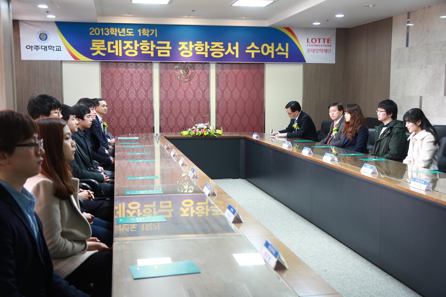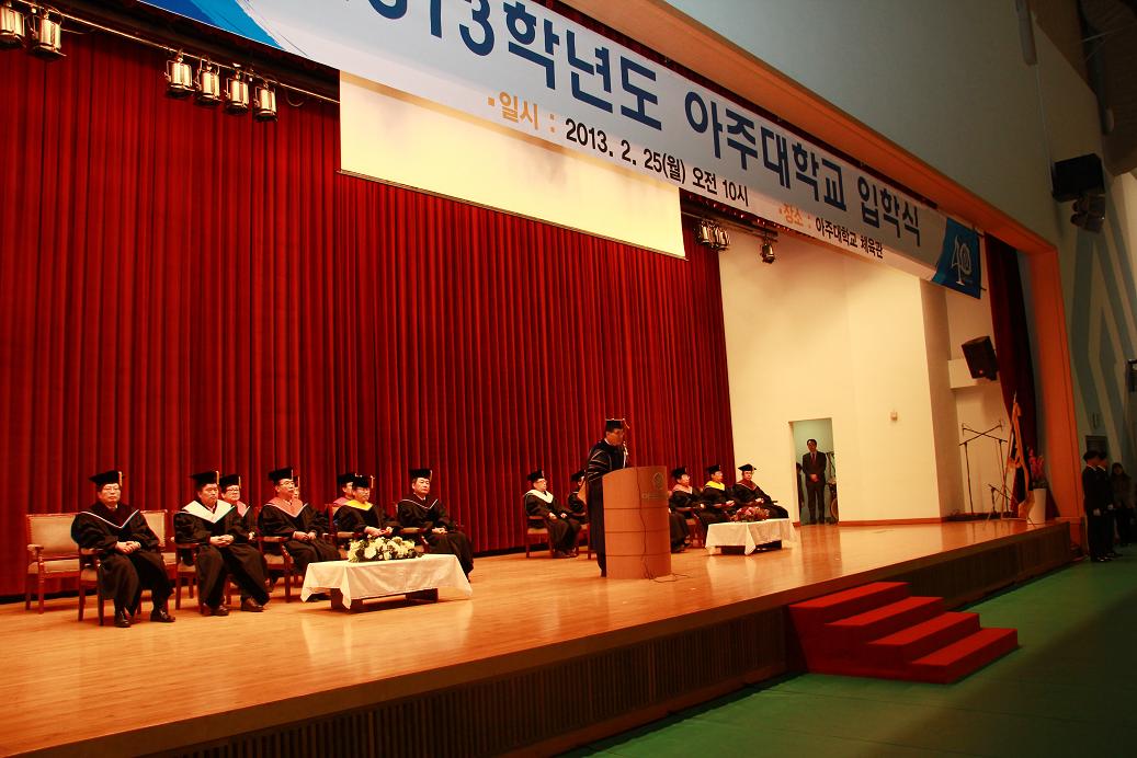 2013학년도 입학식이 25일 오전 10시 우리 학교 체육관에서 열렸다. 학사행렬 입장으로 시작된 이날 행사는 박영동 교무처장의 학사보고, 안재환 총장의 입학허가 선언, 신입생 대표 김진형(기계공학과), 변현오(문화콘텐츠학과) 학생의 입학선서의 순으로 진행됐다. 박영동 교무처장의 본교 교육방향에 대한 특강, 브라스밴드의 축하공연, 우리 학교 응원단과 동아리(소울, 비트)의 신입생 환영 공연도 함께 펼쳐졌다. 안재환 총장은 축사를 통해 “훌륭한 교수님들과 특성화 교육프로그램을 자랑하는 아주대학교는 앞으로 미래를 향한 기나긴 여정의 출발점에 선 여러분의 성장과 발전을 힘껏 도울 것”이라며 “신입생 여러분의 능력을 발전시켜 나가기 위해서는 여러분들 스스로의 열정과 의지가 반드시 필요하다”고 말했다. 안 총장은 또 “아주대학교를 믿고 소중한 자녀들을 보내주신 것에 대해 학부모님들께 깊이 감사드린다”며 “학생들이 우리 사회의 리더로, 성숙한 인격체로 자랄 수 있도록 대학 구성원 모두가 최선의 노력을 다하겠다”고 덧붙였다. 한편 입학식이 끝난 이날 오후 2시부터는 신입생 배치고사(영어)와 학부모 간담회가 진행됐다. 배치고사는 약학대학을 제외한 전체 신입생을 대상으로 치러졌다. 26일에는 이과계열 신입생을 대상으로 수학, 물리학, 화학, 생물학 배치고사가 실시된다. 우리 학교는 신입생의 실력을 정확히 파악하고 이를 바탕으로 맞춤형 교육을 하기 위해 기초과목 배치고사를 치르고 있다. 배치고사 평가 결과에 따라 신입생 필수 교과목인 영어, 수학, 물리학 등의 수준별 반배치가 진행될 예정이다. 종합관 대강당에서 진행된 학부모 간담회에는 총 2000여명의 학부모가 참석했다. 간담회는 김경일 심리학과 교수의 특강, 학교생활에 대한 전반적인 안내와 학교 소개 등의 내용으로 구성됐다.
