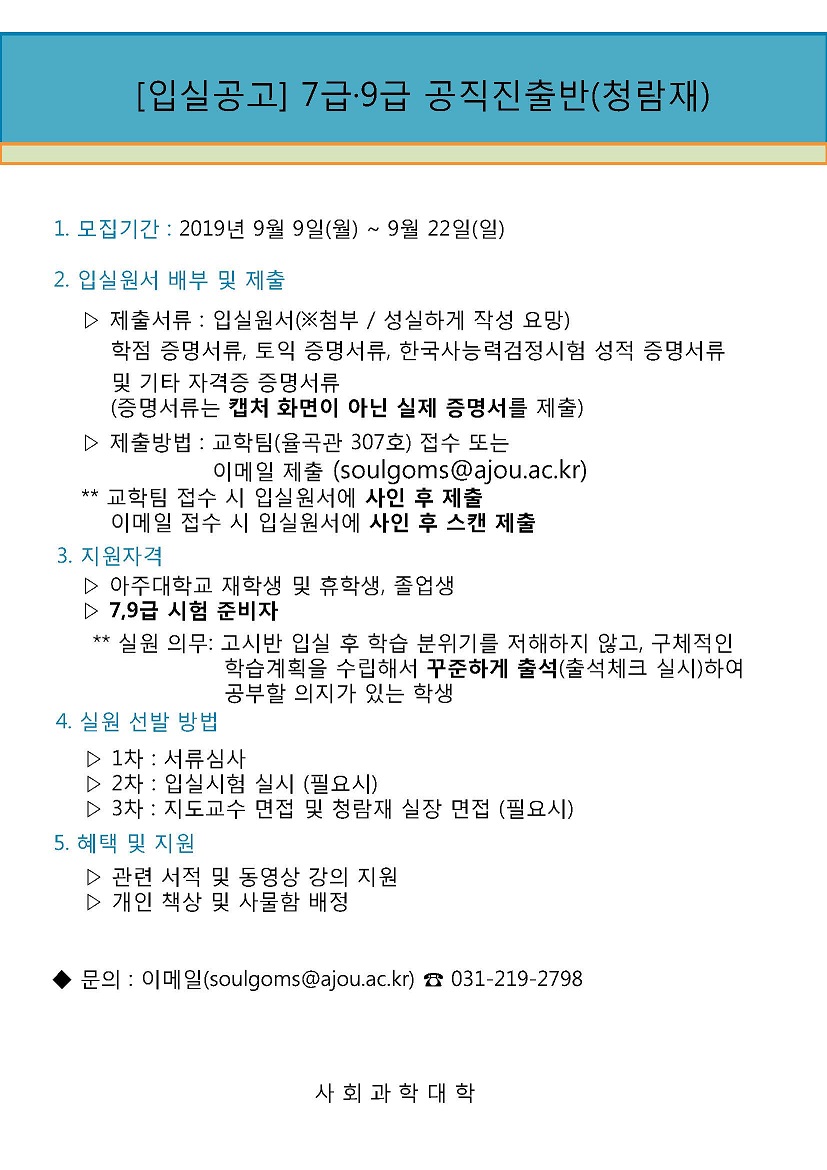 [입실공고] 고시반 청람재(7급, 9급 공직진출반) 모집 안내(~ 09.22.)