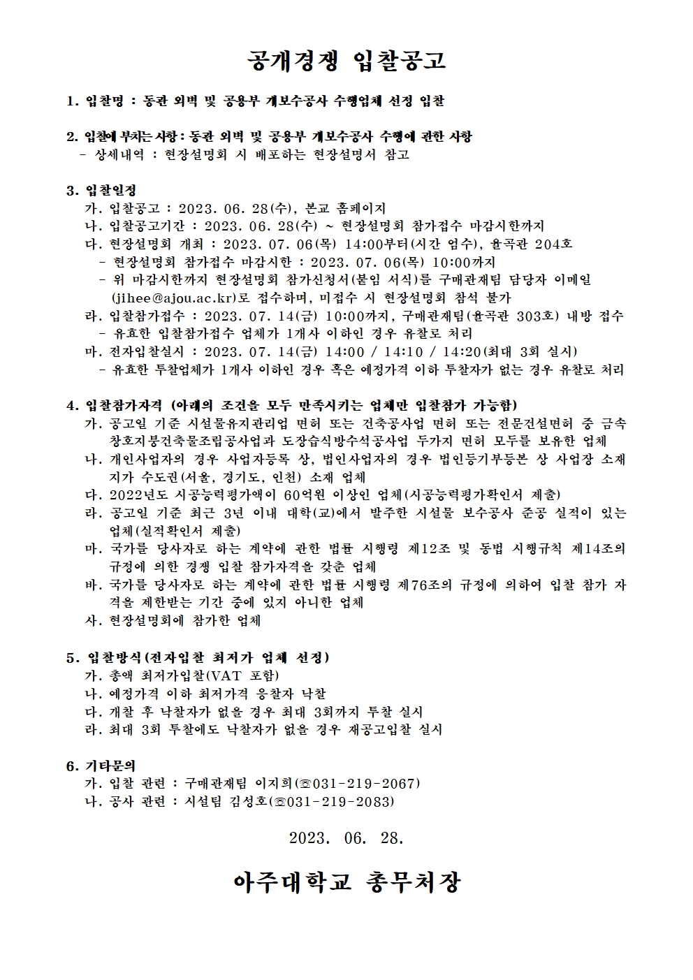 본 페이지에 공고되지 않은 입찰 건(소액입찰 건등)은 상기 '전자구매 바로가기'클릭하여 아주대학교 전자구매시스템 접속, 회원가입 후 입찰공고조회에서 확인바람
